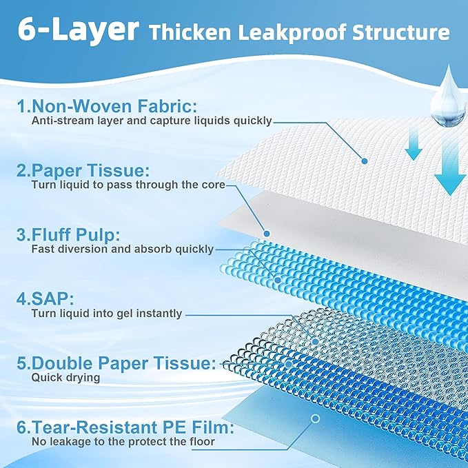 - Super Absorbent & Quick Drying: The 6-layer protection design makes our thickened puppy pee pads much more absorbent than other dog training pads, perforated film as the top layer of the incontinence pads which can speed up the liquid to pass through the surface than common non-woven fabric and keep the surface quick-drying