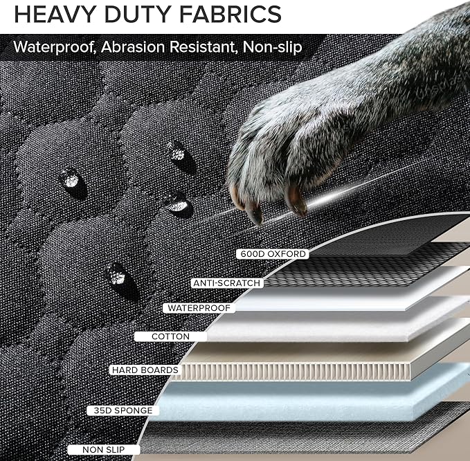 - 7-LAYERED CONSTRUCTION FOR SUPERIOR SUPPORT AND COMFORT - Crafted from durable materials 600D scratch-resistant Oxford cloth, waterproof fabric, reinforced hard bottom boards, 35D soft sponge, and cotton layers, this truck seat cover for dogs offers comfort and a non-slip surface. It shields your truck from damage, with an extra-high door flap to prevent scratches, allowing dogs to enter and exit without hassle