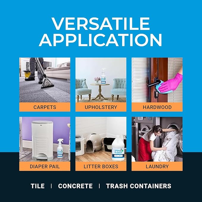 - Versatile Cleaning Solution: Beyond pet stains, Urine B-Gone is ideal for a variety of applications; Use it in your laundry to pre-spray soiled areas or even in drains, urinals, and toilets; This all-in-one cleaner & odor remover makes tackling tough stains and odors simple and efficient
