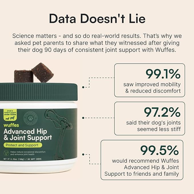- Scientifically-Backed Ingredients: Expertly formulated by our in-house pet scientists, Wuffes Hip & Joint Support is made with ingredients known to help maintain healthy cartilage, promote joint integrity, and support long-term joint health.