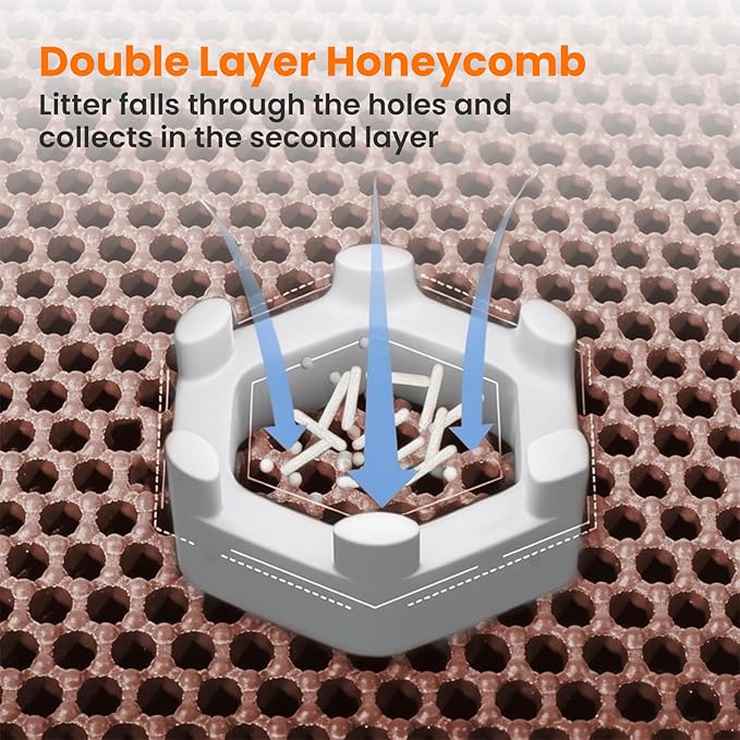 - Double Layer Honeycomb Structure: The holes in the top layer trap all types of litter and let it fall through to the waterproof bottom layer for effortless cleanup. Just lift litter catcher mat, pour the collected litter back, and reuse — no mess, no hassle. This smart design helps reduce litter waste and makes daily cleaning faster and easier!