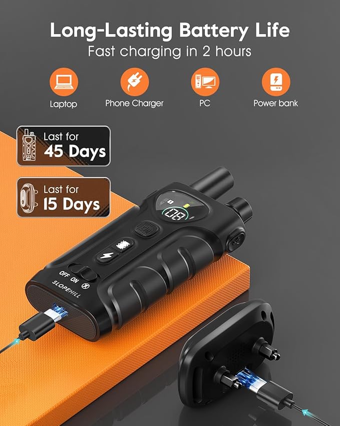 - 【Extra-long life and rechargeable battery】Rechargeable remote and receiver, easy to charge the training collar with remote with any USB charger. You can charge the electric dog collar with your power bank, phone charger or laptop USB charging port.After 2 hours of fully charging, the collar is able to work 15-20 days.Shock collar for dogs will let you enjoy the training time with your dogs during outdoor activities