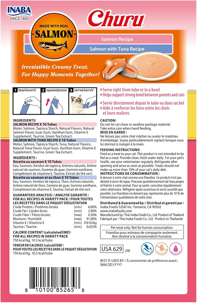 INABA Salmon Churu Cat Treats, Lickable, Squeezable Creamy Purée Cat Treat with Green Tea Extract & Taurine, 0.5 Ounces Each Tube, 20 Tubes, Salmon & Tuna Variety Box