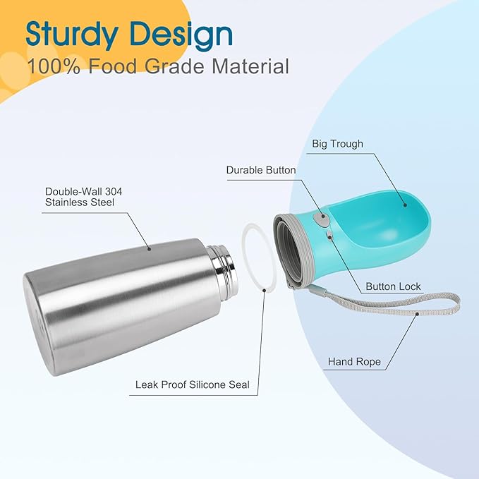 - Durable Material: Made of durable stainless steel, LEAD-free, BPA-free, safe and durable. This portable water bottle for dogs is durable and a reliable companion.