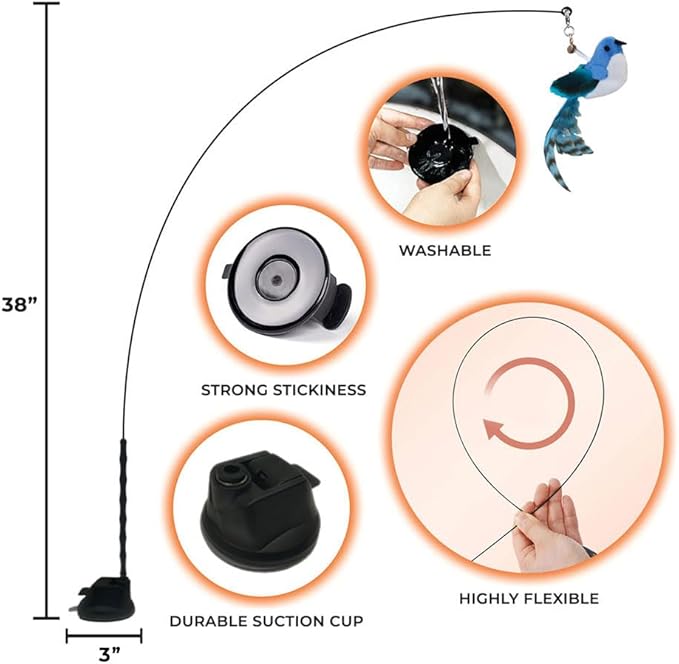 - DURABLE & EASY TO USE: The interactive cat feather toy includes a highly flexible rod and a strong suction cup base that can be attached horizontally or vertically to any flat, clean surface. It also includes a heavy-duty base that's perfect for carpets and more. The best part is that it requires no interaction from you, and your cat can play whenever they want.