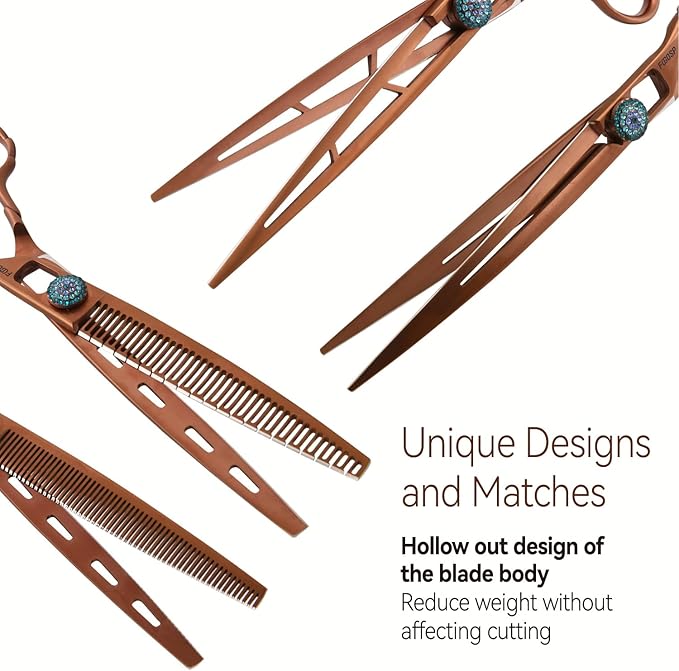 - ๐[Fashion Design and Matching] The dog grooming scissors adopt vacuum electroplating titanium alloy technology, chocolate color, primitive simplicity, elegant, and stable. High precision CNC screws with blue artificial diamonds embedded on the surface, like the eyes of God, dynamic and energetic. Every time you open and close the FOGOSP dog scissors, it feels silky smooth like enjoying chocolate.