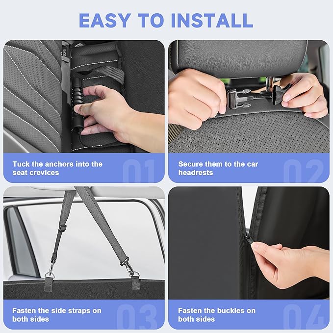 - EASY INSTALLATION FOR ANY DRIVE: This dog car seat cover features an adjustable strap that makes it easy to put this seat cover into any car. Installation is super simple and everything folds up neatly into a small carry bag for your pet's travel