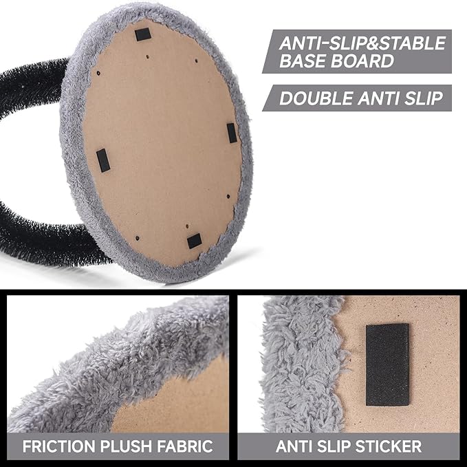 - Stable Base Board: This cat grooming brush is maded of stable density board with a diameter of 15” heavier than wooden board. The bottom with anti slip pad, combined with anti slip plush cloth will not slip even on smooth ground.The base is stable enough for vigorous scratching.