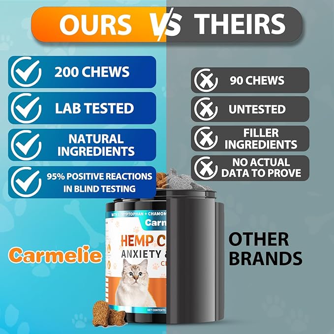 - Gentle Calming Formula: Carmelie's calming chews for cats feature a gentle blend of natural ingredients, including organic hemp seed powder, organic chamomile, L-tryptophan, valerian root, colostrum and melatonin. These calming cat chews provide thoughtful and effective care, helping your cat stay calm and comfortable in stressful situations.