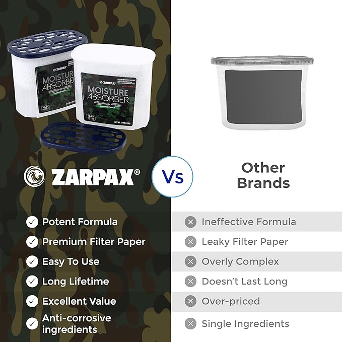 - SAFEGUARD YOUR HOME: Make excess moisture, humidity, and odors a problem of the past with ZARPAX's moisture absorber. Perfect for closets, bathrooms, and kitchens, it can also be used to safeguard important documents or inside boxes, containers, and other storage vessels to protect items from moisture damage. Safeguard your valuables with our moisture and odor eliminator.