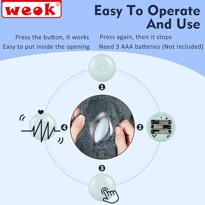 - 【Heartbeat Simulator Module + Plush Toy】The WEOK product contain a plush dog toy and a heartbeat simulator Module. The heartbeat Simulator need 3 AAA batteries(No battery included in the package). Press the button, then the heartbeat module works. Easy to operate.