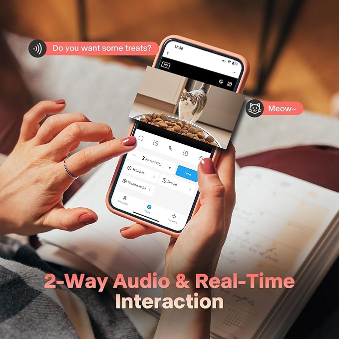- Your Voice, Delivered with Love: Stay connected to your pet through the built-in microphone and speaker that enable real-time, two-way communication. Listen to sounds like your pet chewing their food, speak to them directly for comfort, or record a personal 'meal call' message that plays automatically at each feeding. This feature helps maintain a consistent routine and provides a reassuring presence for your fur babies, even when you're away