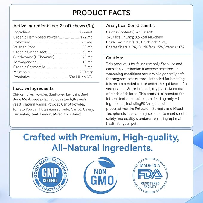 - Natural and Healthy Ingredients: Crafted with natural ingredients like organic hemp seed powder, L-Tryptophan, valerian root, chamomile, colostrum, and melatonin, our calming treats for cats are scientifically formulated to ease tension and improve sleep quality. Free from artificial additives, grains, or sugar, they provide safe and reliable support for your cat’s health.