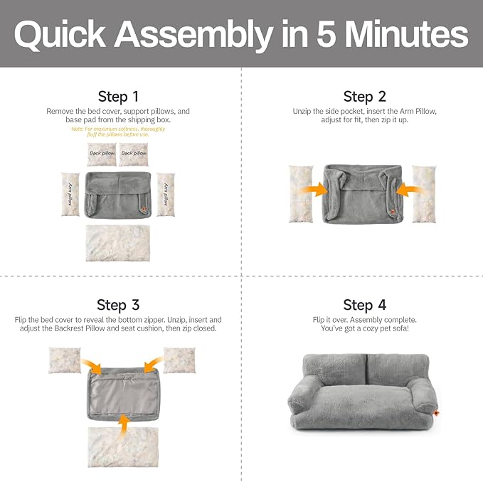 - 【Assemble Tips】Our pet bed arrives as a vacuum packed bed in a box, please pat to make the pet sofa completely fluffy before use, and wait for 48 hours after it, it will return to shape after shaking.