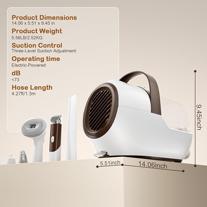 - ๐Quiet & Stress-Free Grooming: Our pet grooming vacuum for dogs features a low-noise design to keep your pet calm and comfortable during grooming. With 3 adjustable suction levels, your dog will feel relaxed and not scared, even at the highest setting, where noise is below 73dB. This makes it the perfect dog hair trimmer for pets who are sensitive to loud sounds.