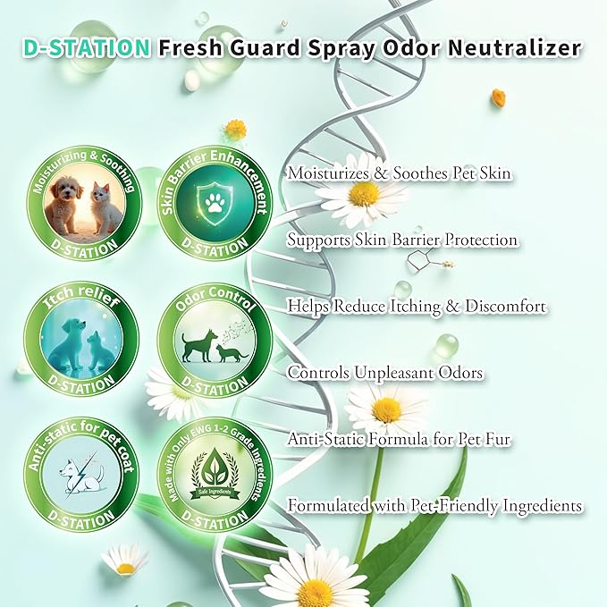 D-STATION PDRN Fresh Guard Spray Odor Neutralizer - Anti-Static, Deodorizing, Enhances Hydration, Itch Relief, Skin and Coat Nourishment, Low-Irritation, Suitable for Dogs and Cats. 6.76 Oz