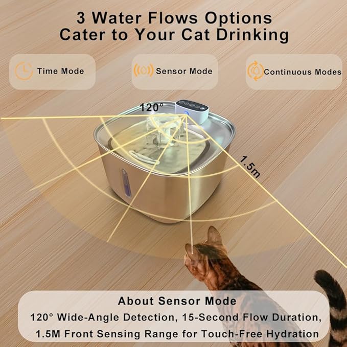 - 3 WATER MODES AS YOUR CHOICES - ① Sensor mode: it flows for 15s when a pet is within 59" (1.5M) and 120° detection range. ② Induction mode: Intermittent mode: dispensing water for 20s at intervals of 20minutes. ③Constant Mode:water flows continuously when plug in,while in battery - powered mode, it runs for 30 minutes and then switches to motion - sensing.