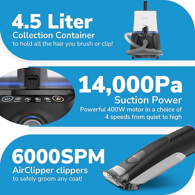 - Total Control: Designed for precision and ease, this dog grooming vacuum kit makes pet grooming simple, effective, and mess-free, ensuring effortless pet hair removal.