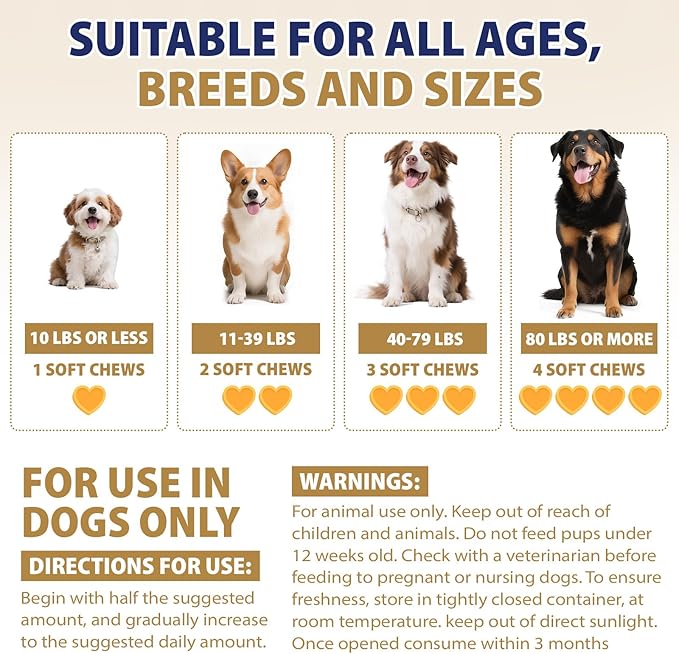 - High-Quality Dog Hip and Joint Supplement: Help dog move freely with dog joint chews, a premium hip and joint supplement for dogs packed with glucosamine for dogs, chondroitin, MSM, and turmeric. These key ingredients in dog joint supplement strengthen cartilage, support dog joint flexibility, and reduce stiffness, ensuring pup stays active and comfortable. Whether dog arthritis, hip dysplasia, or age-related mobility issues, dog supplements for joint and arthritis provides the relief they need