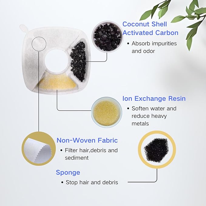 - 【High quality material】: Ion Exchange Resin can soften water & reduce heavy metals.Coconut Shell Activated Carbon can absorb impurities & odors.Non-Woven Fabric can filter hair,debris & sediment.Sponge can block hair and debris.(The product uses more abundant materials)