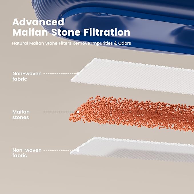 - ๐พ 3-Layer Maifan Stone Filter โ Built-in filter system with non-woven fabric + maifan stone + non-woven fabric removes hair, dust, and impurities to keep water clean.includes 2 replaceable filters (recommend changing every 30 days).