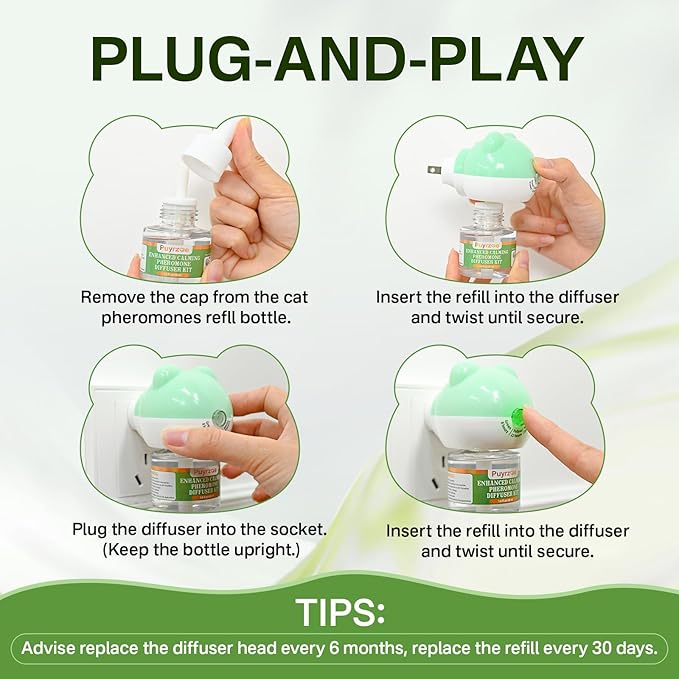 - GENTLE STRESS RELIEF FOR CATS: The Puyrzoe cat calming diffuser releases a gentle pheromone-inspired formula to help ease common stress-related behaviors in cats, such as scratching, urine marking, hiding, or tension. Whether it’s a new environment, loud noises, or separation from owners, this cat pheromone calming diffuser helps create a more peaceful and relaxed living space for your feline companions.