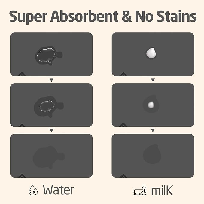 - ♔ Super absorbent and Fast dry:This pet food mat Can quickly absorb spilled water and milk without leaving any marks, no need to manually pour water, avoid wetting pet paws even for messy drinkers. Keep the pet's eating environment tidy and clean.