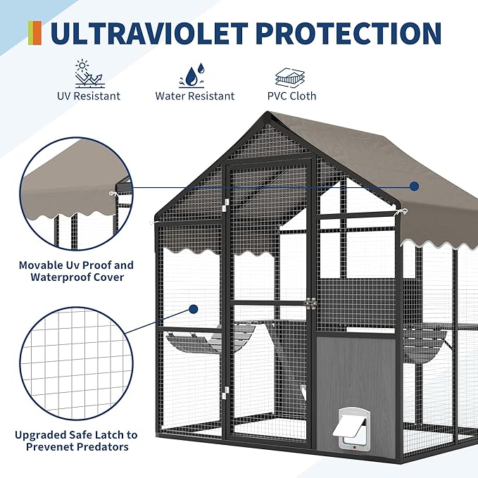 - WEATHERPROOF COVER - The cat patio features a thickened Oxford cloth cover that provides cool shade on sunny days, helping to keep your pets healthy and hydrated. It is also water-resistant, ensuring the enclosure remains dry during rainy days. This cover protects your cats from wind, rain, and snow, creating a comfortable and secure environment for them, regardless of the weather