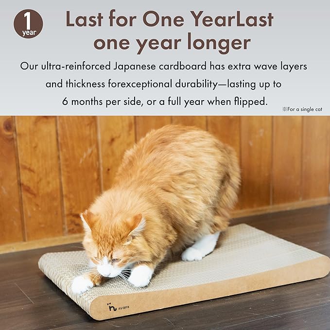 - The Ultimate Cat Scratcher for Happy, Healthy Claws!: Cats instinctively scratch to keep their claws healthy and mark their territory. nyans Cat Scratcher is specially designed to replicate the feel of natural wood, making it irresistible to your feline friend. Made from premium reinforced Japanese cardboard, it’s ultra-durable, producing minimal debris for a cleaner home.
