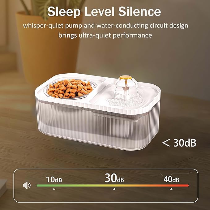 - 2 In 1 Cat Water fountain: Our 2-in-1 pet water fountain and food bowl features a unique and thoughtful design. It share the same base, but with isolation design to prevent food from entering the water fountain, avoiding dirty water or blocked water flow that may cause leakage. The 15-degree elevated design also reduces spinal pressure and makes feeding and drinking easier and healthier for your furry friend