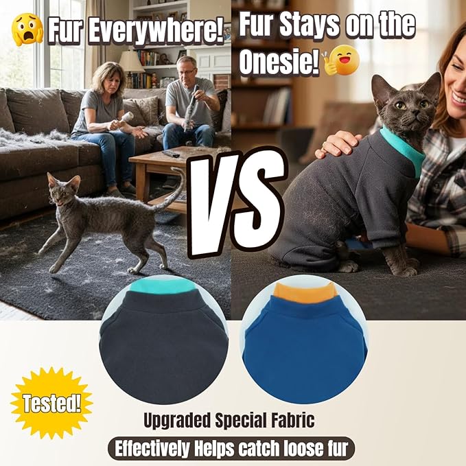 - Save Time on Cat Hair Clean up: The cat suit is made of professional hair sticking material, catch shed hair during seasonal changes. With this cat clothes, you can save time and effort removing cat hair from clothes, sofas, carpets, and more