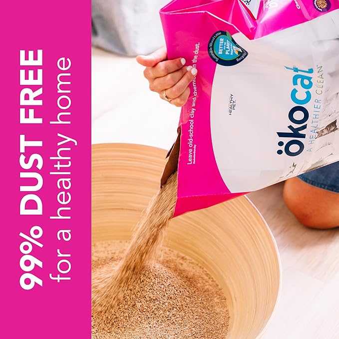 - 99% DUST FREE FOR A HEALTHIER HOME: Clean wood fiber is screened & de-dusted for a cleaner pour. okocat natural cat litter has NO dirty clay dust. NO artificial fragrance, synthetic chemicals, or toxic dyes, and NO Zeolite. Biodegradable & compostable.