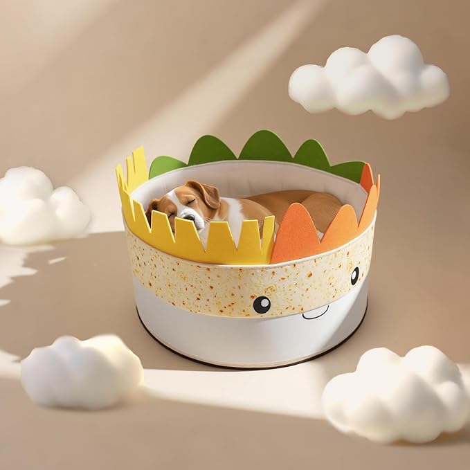 - Give Your Baby a Unique Burrito: Every cat is special, and their bed should be too. Our cute cat bed features a golden crust that looks freshly baked, with three vegetables and a smiling face that warmly invite your kitty to enjoy this treat. And when your kitty curls up inside, they’ll instantly become the star of your social media!