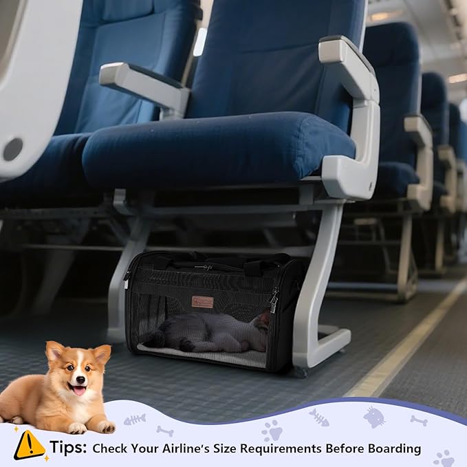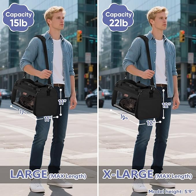 - Check Size First: The pet carrier is collapsible and available in two sizes: L (17"x11"x11", Airline Approved) for pets up to 15 lbs, and XL (19"x12"x12", NOT Airline Approved) for pets up to 22 lbs; Note: Check your airline's size regulations before boarding to ensure compliance; For a proper fit, please reference your pet's length and height rather than relying solely on weight