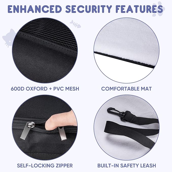 - Durability and Comfort: Made of 600D waterproof fabric and PVC mesh, this pet carrier for cat resists daily wear and scratches from pets; The integrated iron wire and rubber frame maintain its shape even when empty; While the 3mm fiberboard base offers stability, and a removable soft plush mat ensures a comfortable sleeping space for your pet during trips