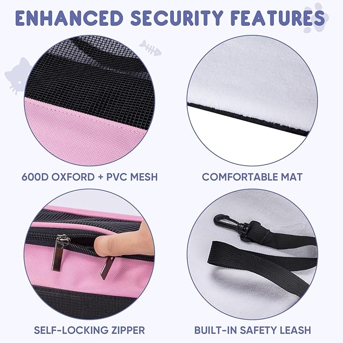 - Durability and Comfort: Made of 600D waterproof fabric and PVC mesh, this pet carrier for cat resists daily wear and scratches from pets; The integrated iron wire and rubber frame maintain its shape even when empty; While the 3mm fiberboard base offers stability, and a removable soft plush mat ensures a comfortable sleeping space for your pet during trips