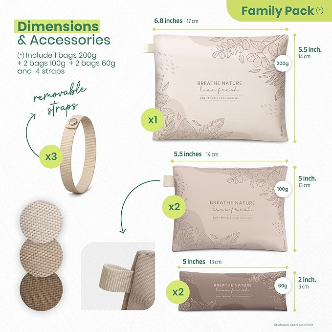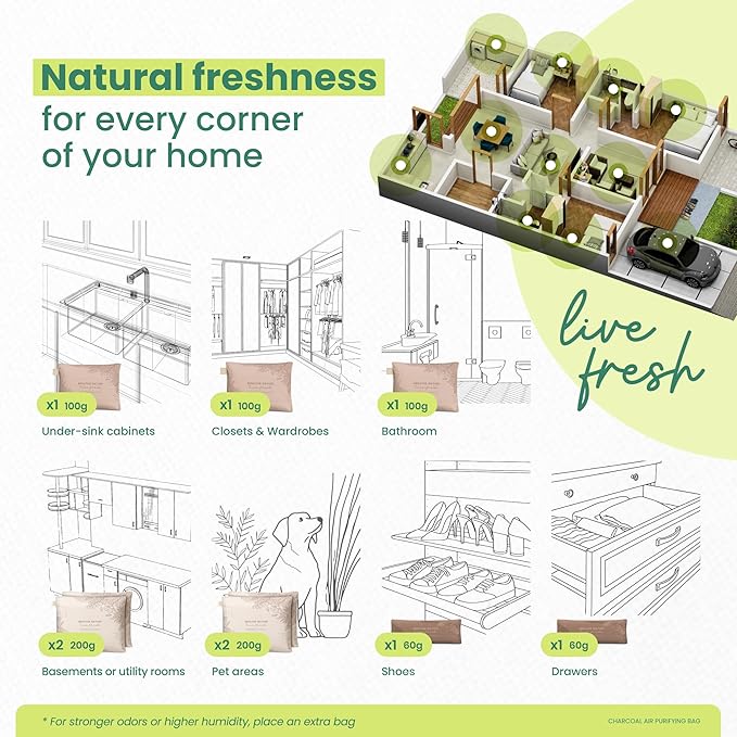 - NATURAL ODOR ABSORPTION TECHNOLOGY: – Harness the power of bamboo charcoal bags to naturally purify your living spaces. This advanced odor absorber targets moisture and bad smells at the source—perfect for closets, cars, bathrooms, shoe racks, cat litter boxes, cabinets, and even the basement.