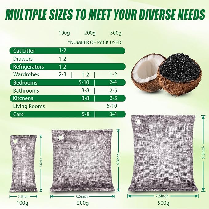 - Natural, Non-toxic, and Safe: The Coconut Shell charcoal bags are made of 100% Nature. They are safe for children and pets, without any fragrance and chemicals. Standard size Coconut Shell charcoal particles have a larger contact area with air, the performance of adsorption is better, effectively remove odors and bring fresh air.