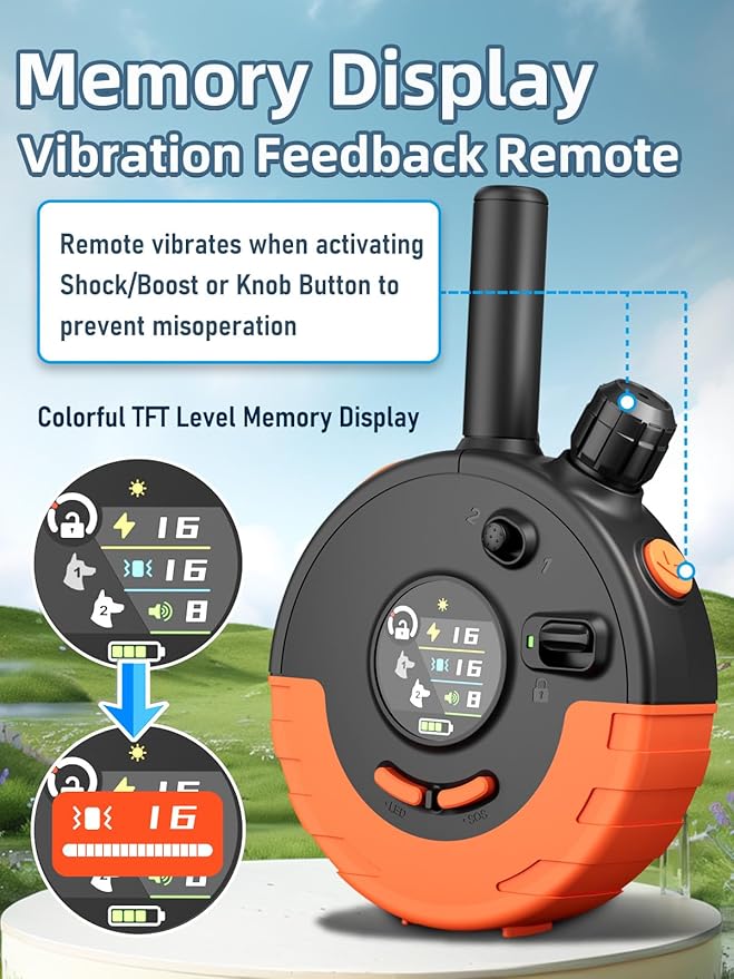 - 【Memory Display & Vibration Feedback Remote】Colorful TFT screen displays all training levels and remembers previous settings for next sessions. The ergonomic remote of electric dog collar fits comfortably in either hand, and vibrates when activating Shock or Boost to prevent misoperation — quick corrections without looking.