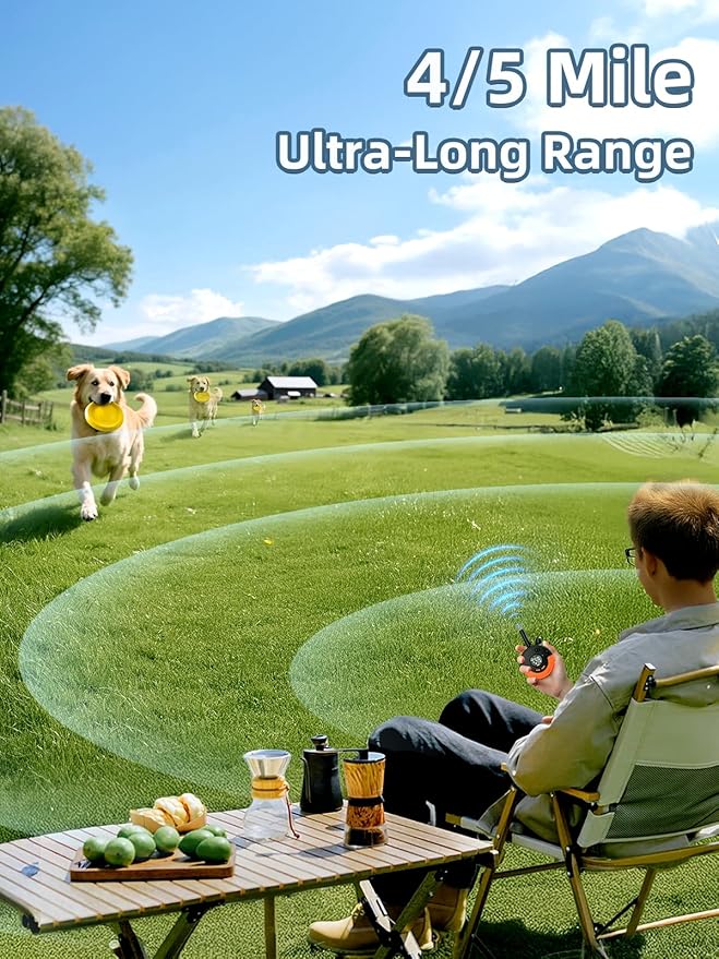 - 【Ultra-Wide 4/5 Mile Range for Maximum Freedom】This dog training collar with remote features a 4/5 mile ultra-long range, ideal for parks, hikes, and open spaces. Whether you're working on recall or off-leash commands, enjoy reliable control with zero signal dropouts—perfect for outdoor training sessions.
