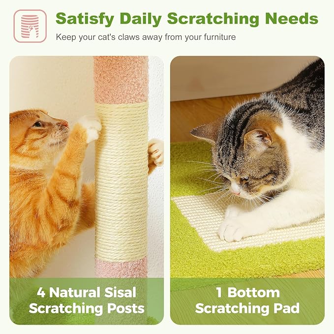 - Built-in Scratching Pad & Sisal-Covered Posts: The bottom scratch pad and 4 sisal-wrapped scratching posts help protect furniture by encouraging healthy scratching habits. The durable sisal rope resists clawing, keeping your cat’s nails trimmed while saving your sofa and carpets from damage.