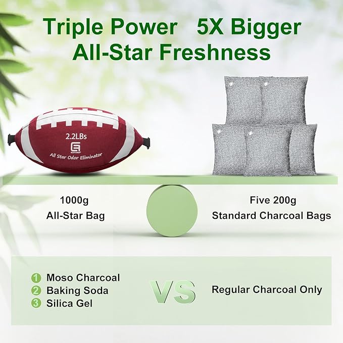 - Oversized 2.2 lb Bag for Superior Performance: Unlike standard 200g deodorizers, our jumbo 1000g activated charcoal odor absorber (2.2 lb) bag delivers over 5 times the odor-fighting power. Perfect for larger spaces or stronger odors, it works longer and harder to keep your air clean and fresh. Ideal for use in bedrooms, garages, basements, living rooms, and anywhere stubborn smells tend to linger.