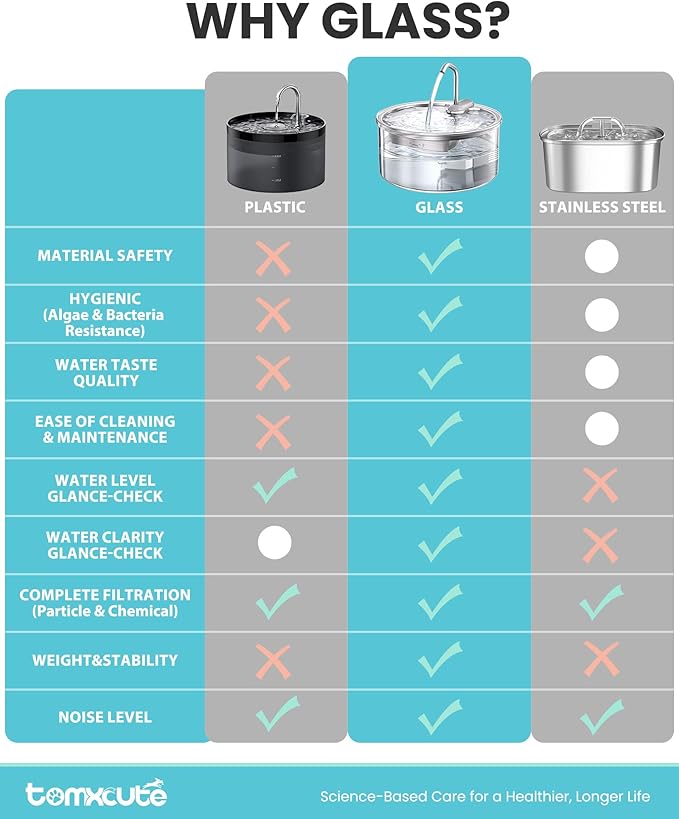 - Crafted from Durable, Thickened Glass - Our fountain is made from premium, high-density glass, significantly thicker than standard models. It's built to resist chipping, cracking, and everyday wear, ensuring long-lasting use for even the most enthusiastic pets.