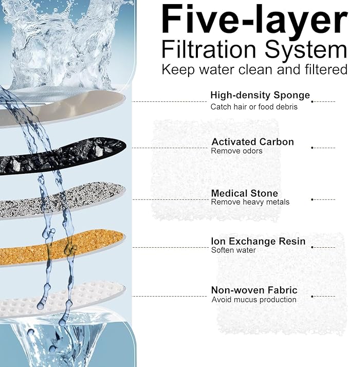 - 【5 Layers Filtration】: The cat water fountain filters are made of sponge, activated carbon, medical stone, ion exchange resin, and non-woven fabric. This ensures your cat drink fresh water, clean water for a week, we recommend using softened or filtered water. Also please replace the filters every 2-4 weeks to keep good filtration.