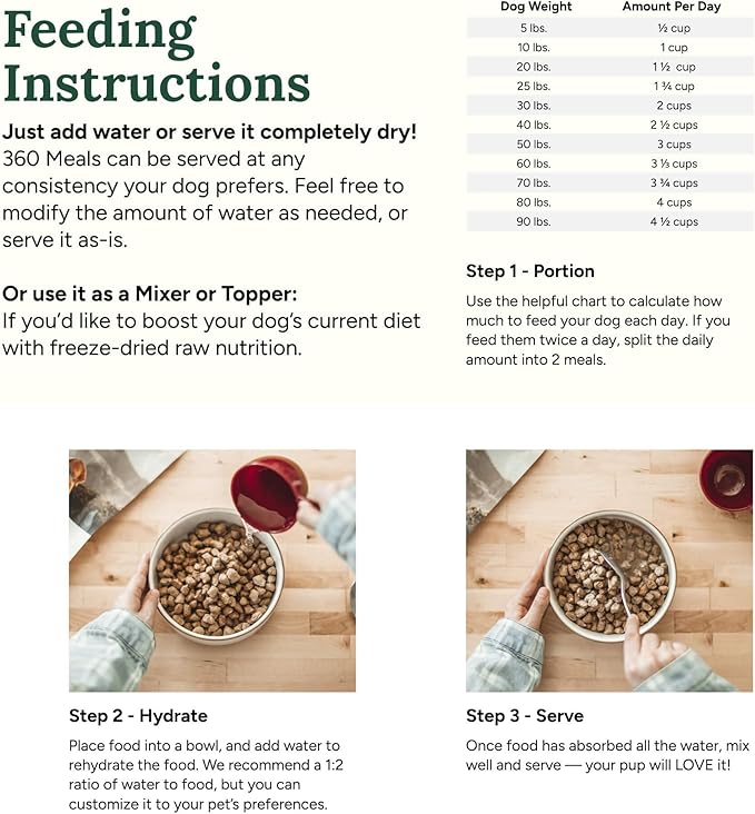 - Serve as a Meal or a Topper – Use as your dog’s complete meal or sprinkle over their usual food for added variety and taste. If using as a topper, reduce the amount of their current food to avoid overfeeding.