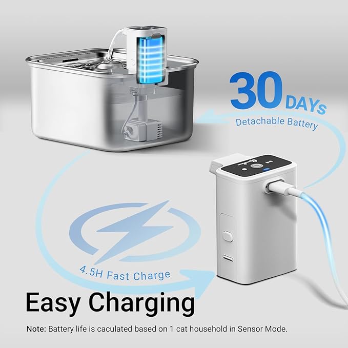 - Long-lasting Battery Life: DownyPaws battery operated cat water fountain features a built-in 4,000mAh rechargeable battery and a detachable design for easy charging. There is no need to worry about your cat's hydration during emergency power outages or short trips