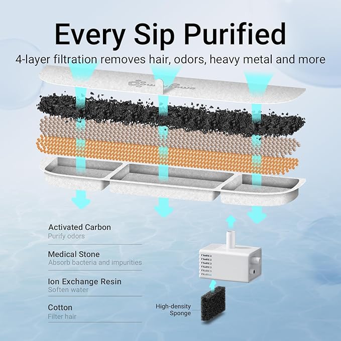 - Enjoy Every Sip of Fresh Water: DownyPaws cat fountains for drinking employs a multi-stage filtration system that effectively removes hair and impurities while releasing trace elements and softening the water to enhance palatability