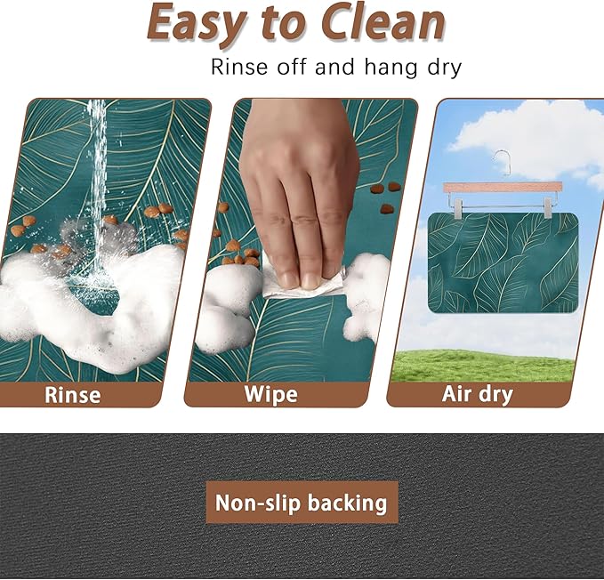 - Absorbent: This Tropical Palm Leaves pattern pet food mat helps prevent liquid spills and keeps your pet's eating area clean, making it a practical addition to your pet supplies. It helps keep paws dry even for pets who love to drink water. The sturdy design is resistant to tearing and helps prevent accidental ingestion.