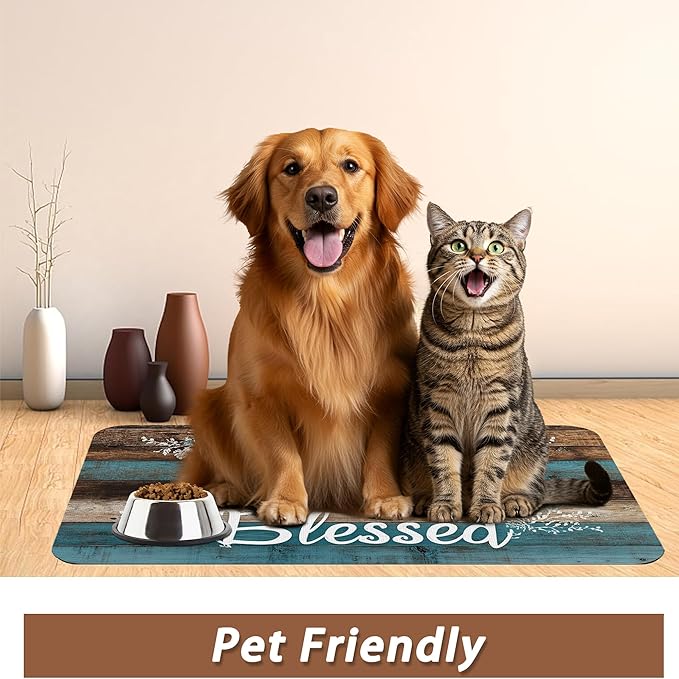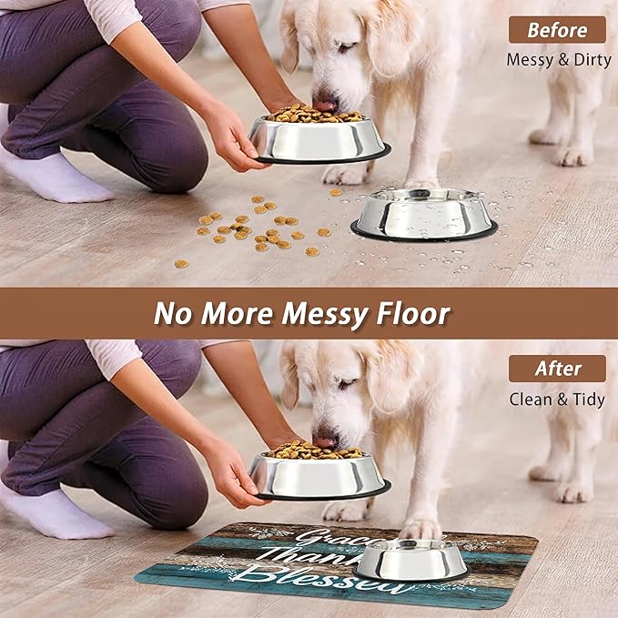 - Absorbent: This Thankful Grateful Blessed Vintage Wooden pattern pet food mat helps prevent liquid spills and keeps your pet's eating area clean, making it a practical addition to your pet supplies. It helps keep paws dry even for pets who love to drink water. The sturdy design is resistant to tearing and helps prevent accidental ingestion.