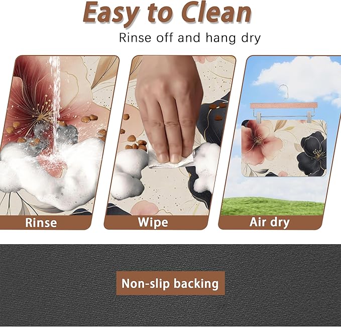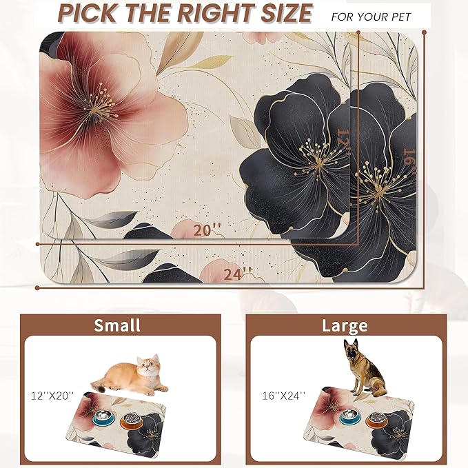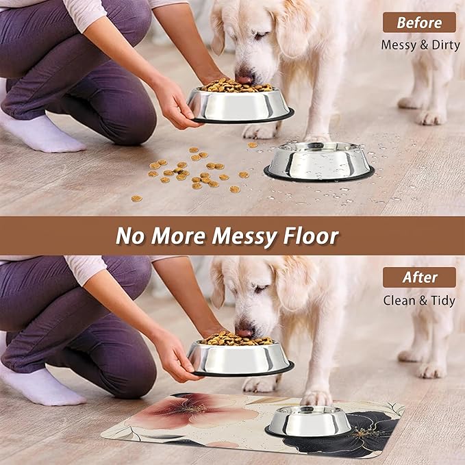- Absorbent: This Pink Floral Boho Flower pattern pet food mat helps prevent liquid spills and keeps your pet's eating area clean, making it a practical addition to your pet supplies. It helps keep paws dry even for pets who love to drink water. The sturdy design is resistant to tearing and helps prevent accidental ingestion.